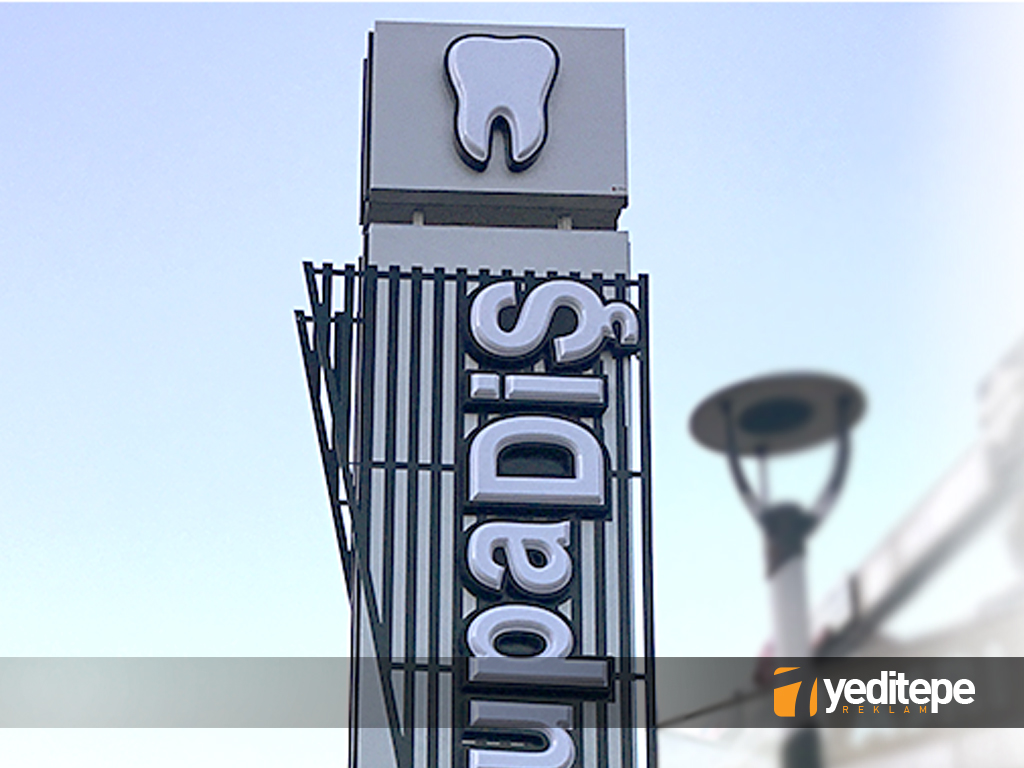 Avrupa Diş Totem Tabela için yapılan totem tabelada, alüminyum kompozit üzerine dekoratif ızgara uygulaması yapılmıştır. Bu zeminin üzerine, vakum ile şişirilmiş kutu harfli ışıklı tabela yapılmıştır, Kendinden fırın boyalı alüminyum kompozit panele , harf yanakları fırın boyalı 1,2mm alüminyum, ön yüzeyi 3mm plexglass olacak şekilde kutu harf yapılmıştır . Bu harflerin içerisine modül LED aydınlatma yapılmıştır. İstanbul Beylikdüzü’nde totem uygulaması yapılmıştır.