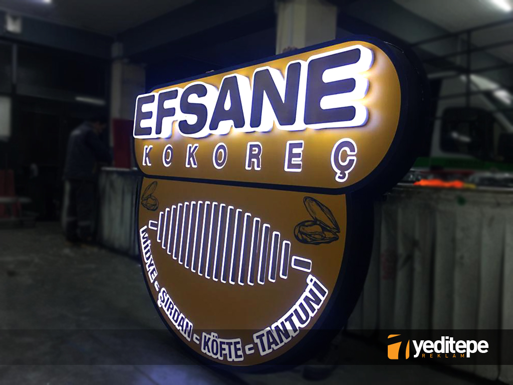 Efsane Kokoreç için hazırlanan reklam panosunda, firmanın kurumsal kimliğine uygun şekilde, alüminyumdan zemin oluşturulmuştur. Bu zemin firmanın kurumsal renklerinde fırın boya ile boyanmıştır. Reklam panosunun bir bölümü plexglass kutu harften bir bölümü alüminyum dekupe harflerden oluşmaktadır. İçten LED aydınlatma olan bu reklam panosu , Bahçeşehir Gölet lokasyonun da montaj yapılmıştır.